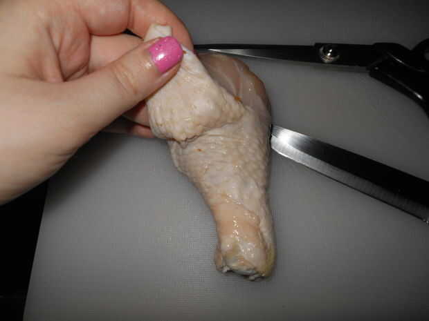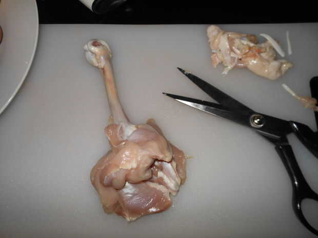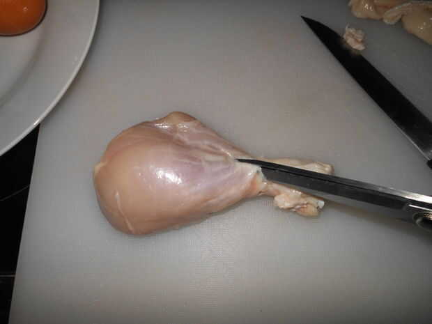 Si la pierna de pollo tiene piel, su bastante fácil de eliminar, si tira en él lo suficiente, la mitad del tiempo va solo estafan. Cuando llega a la base de la baqueta, cortando la piel a medida que avanza, usted necesitará clavan sus tijeras y cortar el empalme del extremo para revelar eso hueso de aspecto agradable que será uno de los huesos asomando de su Ano Niku.