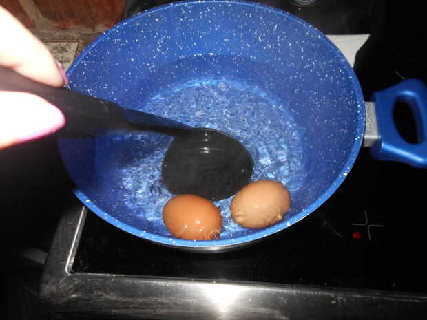 2 de los 3 huevos y poner pequeños agujeros en el extremo con un alfiler, esto los hace más fáciles de pelar. Ponga una olla de agua a hervir y con un cucharón suavemente deje caer sus huevos en el agua caliente y comenzar a revolver. La agitación debe causar que la yema de huevo a cocinar en el centro del huevo. Usted no necesita hacer esto todo el tiempo que se cocinan, sólo para los primeros minutos. Dejarlos hervir y ver ellos mientras prepara su carne. Unos 8 minutos.