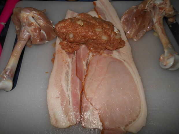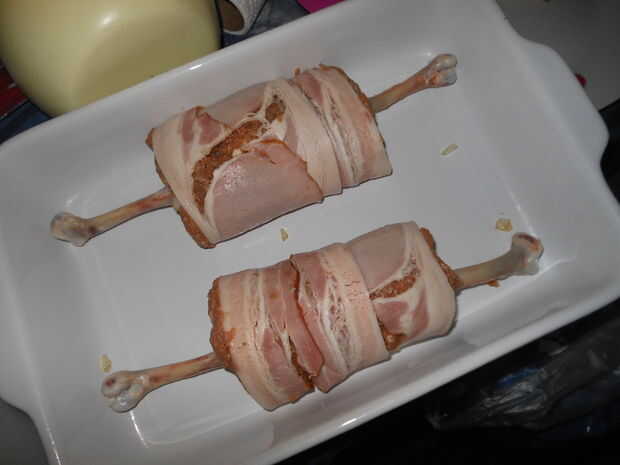 Tomar 2 de los huesos del muslo y los ponen a ambos lados de la panceta, lado hacia fuera del hueso y asegúrese de que la mayoría de la carne está en el centro. Si sus muslos eran muy carnosos, puede que necesite recortar parte de la carne fuera y moverlo o eliminar completamente. Una vez que se colocan los huesos, poner su huevo hervido y pelado en el centro y trabajar en el pollo es algo cocooning el huevo.
