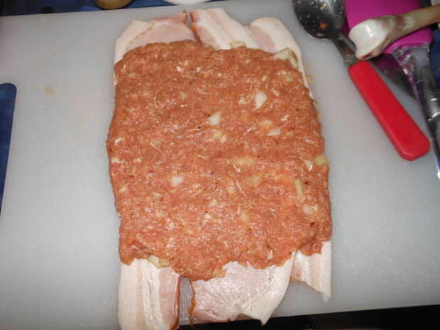 Desea establecer su tocino para formar una hoja como se puede ver en las fotos. Mi tocino era muy larga así que realmente la corte por la mitad y sólo utiliza 3 rodajas en lugar de 6, pero más tocino que no es largo por eso te recomiendo 6 piezas.