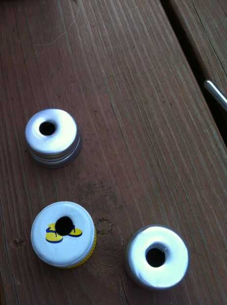 -Si no tienes tapones de metal se puede utilizar plástico corcho botellas de vino (se descompone el corcho real). Para hacer esto siga las mismas instrucciones arriba pero uso la broca más grande que quepa en el corcho. la razón de esto es cuando usted vuelva a colocar el corcho en la botella el agujero se va estrechando y restringe el flujo de agua. He utilizado este método, pero los resultados no eran ideales (es decir muerto de mi planta).