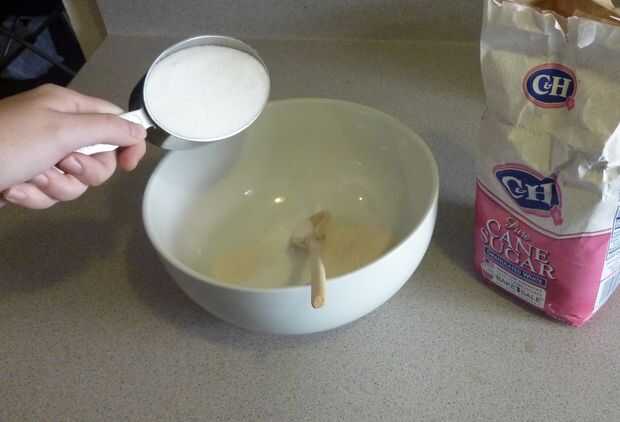 Usando un recipiente limpio, mezcle el azúcar y la pectina en un bol. Añadir la mezcla de la fruta al recipiente y agitar durante tres minutos. Asegúrese de que se mezclen bien la pectina y el azúcar con la fruta.