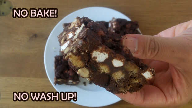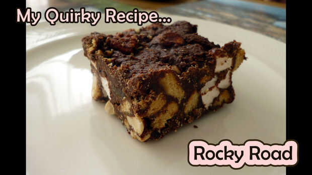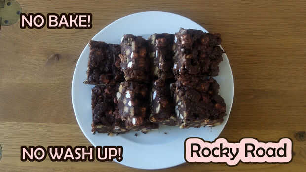 Rocky Road es un simple hacer de chocolate con galletas machacadas y malvaviscos. Mi versión tiene extras cacahuetes y pasas añadidas. La peculiaridad de esta receta no es recipientes de mezcla para lavarse para arriba! Y microondas, horno ni estufa...
