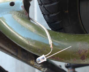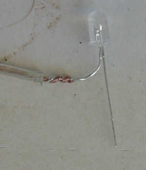 Ahora se toma una de las patas del led y envolver para arriba de la misma manera como lo hizo con las resistencias.