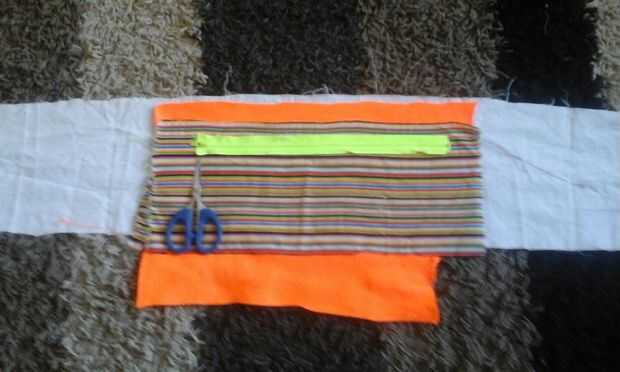 La cremallera debe ser más corta que todos 3 telas usar para este proyecto. así línea sus tejidos juntos en orden usted desee, con la tela cómoda en el medio como un sandwich! Recuerde poner el colorido lado impreso hacia afuera, lejos de su capa media 'invisible' que sirve para proteger la tableta de arañazos. corte a través de todas las 3 capas a la vez para asegurar que permanecen del mismo tamaño y forma. cortar hasta el tejido más pequeño, en un rectángulo con ninguna tela restante flecos más allá de su corte.