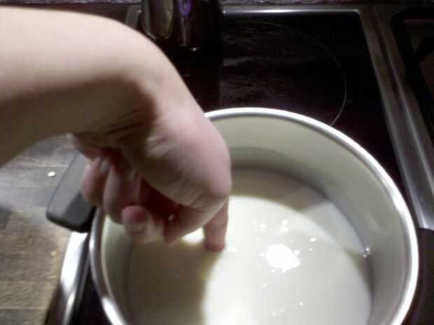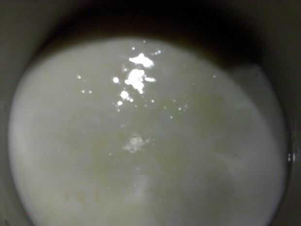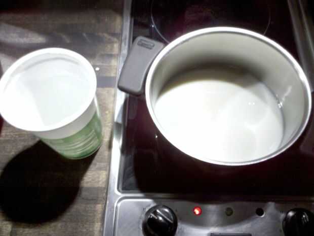 Preparar todos los ingredientes para ser a mano y a temperatura ambiente excepto el suero de leche, que debe ser alrededor de 35 ° c (~ 95 ° F) o: agradable y cálido al tacto. Calienta el suero de leche en la estufa, donde usted podría notar una ligera agregación del "blanco pegajoso líquido" se separa un líquido amarillento, acuoso. Espero la foto explica que uno mejor... pero de todos modos, puede volver a mezclarlo con una cuchara o batir si eso sucede. Ver la temperatura de cerca y no medirlo cuando los dos líquidos están separados, ya que el blanco será más frío que el amarillo. No me preguntes por qué...