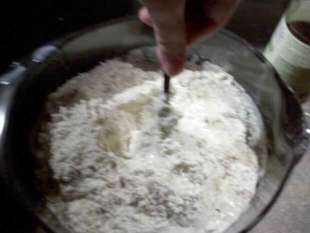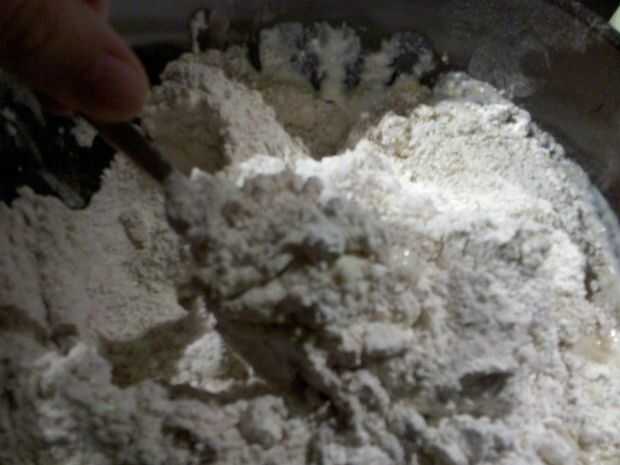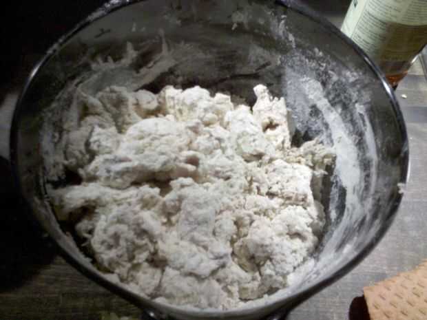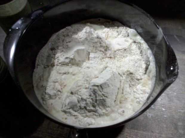 El suero de la leche esté bien caliente pero no caliente (de lo contrario los beasties levadura pobre va a morir una muerte del calor), vierta en el recipiente y revolver con una cuchara. No pasará mucho tiempo hasta que vas a tener una gruesa gota de goo en esa cuchara y el mango (ver última foto en este paso), y llegará solamente hasta ahora con revolver de esa manera antes de que tendrás que pasar a amasar.