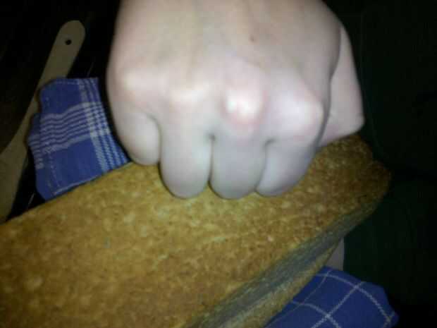 El pan 's listo Si suena hueca al golpear en la parte inferior. Tenga mucho cuidado de las manos, haciendo que el pan está caliente! Si no suena hueco, darle otro 10 minutos, y luego intenta otra vez. Si usted siente que está oscureciendo demasiado para su gusto, cubrir con papel de aluminio (y tal vez lo Hornee a una temperatura inferior la próxima vez!)