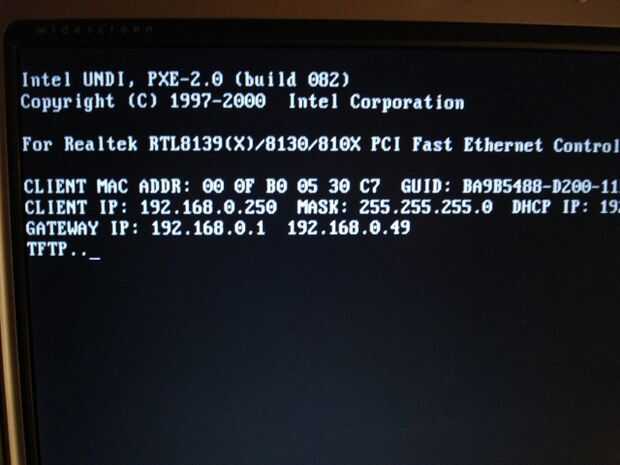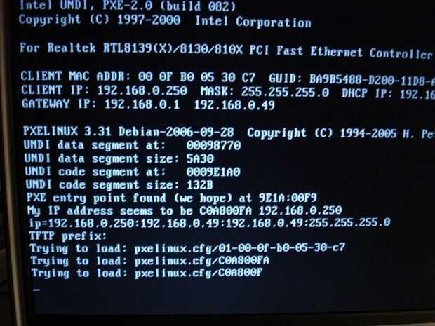 PC Pre eXecution Environment ha hecho una difusión para encontrar un servidor de arranque, el servidor de arranque ha contestado. DHCP asigna una dirección. Una imagen ejecutable está a punto de ser transferido por una pequeña versión de FTP.