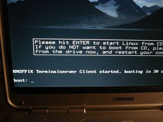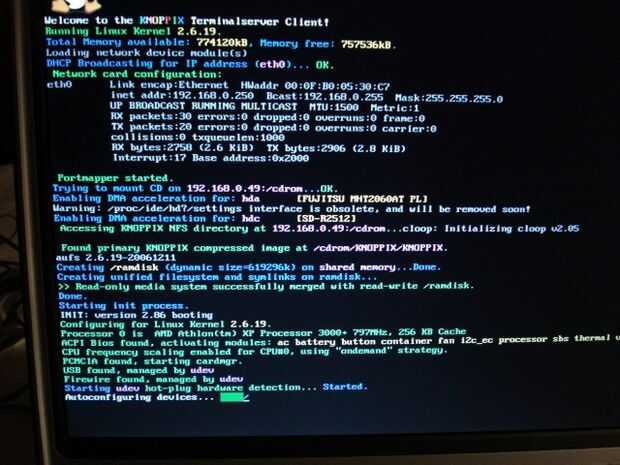 Nota el servidor de Terminal server que cliente ha comenzado – ahora la secuencia de inicio continúa como normal. Si necesita especificar parámetros especiales de arranque – hacer ahora. Tenemos ninguno, presione la tecla enter y estamos al lado y ejecutar arrancando el PC sin disco de la KNOPPIX ejecutable que fue transferido desde el servidor de arranque a esta estación de trabajo en la red. Knoppix reside completamente en la RAM.