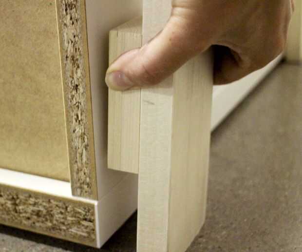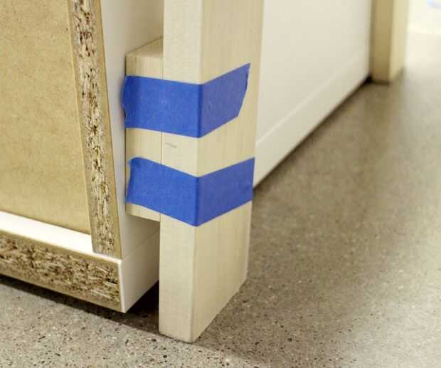 Coloque el primer calce entre el montante y el gabinete, con los extremos de ángulo orientados de modo que la parte superior e inferior son paralelas con el suelo. 4" marca debe alinearse con el centro de la cuña.