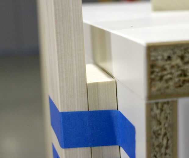 Ahora vas a la cinta de la parte superior cuñas en su lugar para que alinee con la costura entre la parte superior y lateral del gabinete. (como en la foto) Cinta adhesiva en su lugar.