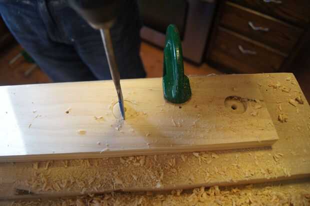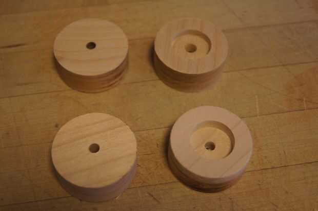 Paso Nº 4 Voltee la madera, taladro de 1 pulgada, 1/4 pulgadas de profundidad, cada rueda... estas se pegan en los extremos de la espiga como perillas. Los otros se utilizarán para las ruedas delanteras.