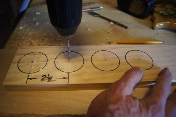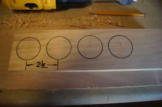 Paso n º 1 En un pedazo de 1 X 4 X 1 pie centros de diseño de pino para las ruedas, de 2-1/2 pulgadas entre centros.