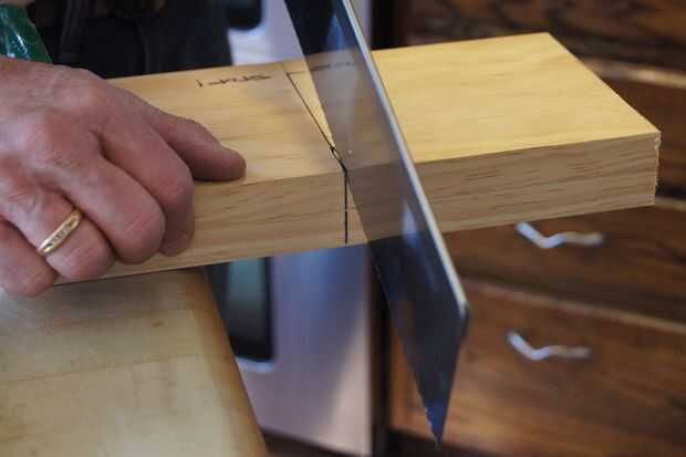 Paso Nº 3 Con las dos piezas con abrazadera juntos, corte cuidadosamente a lo largo de la línea central con la Sierra de espalda. Deje de ¾ pulgadas desde el borde inferior.