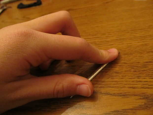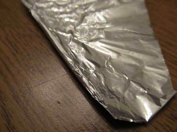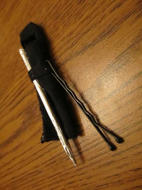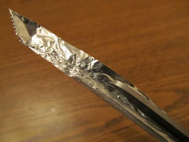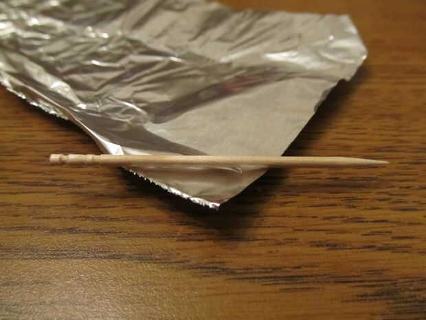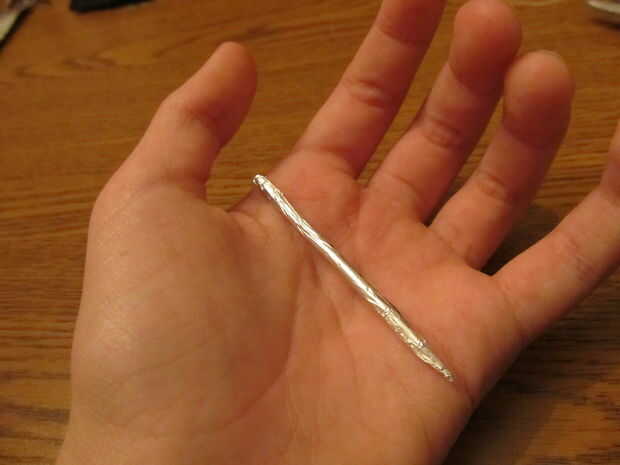 Colocar el palillo en la esquina de su papel de aluminio y comenzar a rodar para arriba. No hacer demasiado gruesa, de lo contrario no cabe en su cinturón de utilidad. Cuando tienes bastante enrollada, cortada del resto y aplanar hacia fuera uno y el otro rodillo en un punto o roll en puntos dependiendo de qué tipo de palillo de dientes tiene. Una vez terminado, poner el palillo de dientes de la hoja y la horquilla en las partes laterales de la correa de la utilidad.