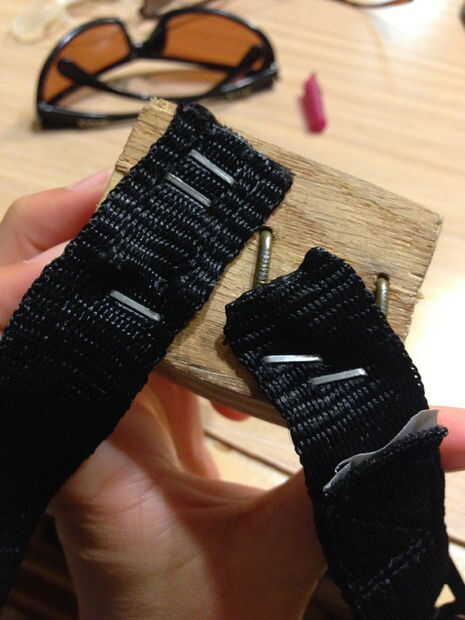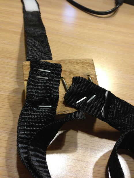 ver fotos de la colocación de las correas y donde las correas de la grapa en. no engrape en las uñas. Asegúrese que la hebilla hacia abajo por lo que al girar sobre el cuerpo la hebilla es rightside arriba. Corte la etiqueta que debe estar frente a usted.