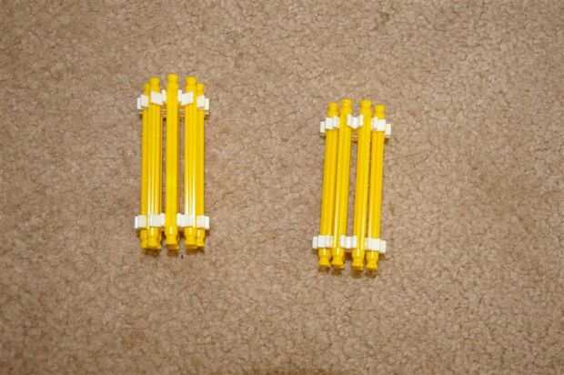 8 uso de las barras amarillas a ir alrededor de dos de los conectadores circulares de la blanco como se muestra a continuación. Y repita. Esto hace que sus dos asas.