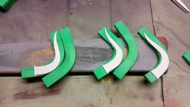 Los puntos secundarios fueron fabricados a partir de plástico de estireno. Este plástico fue cortado a la forma que quería los picos en. Ellos, pegué con pegamento caliente, trozos de espuma que formaron en una curva utilizando una pistola de calor. Usé la misma técnica de sándwich en estos, como lo hice la espiga principal. La diferencia es sólo una pieza unidireccional de plástico en el centro, en lugar de una columna de 2 vías.