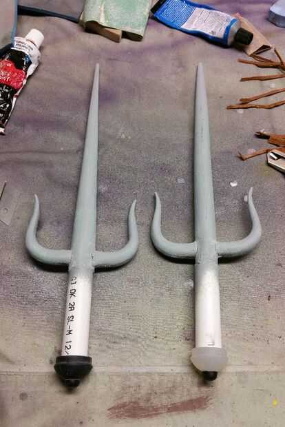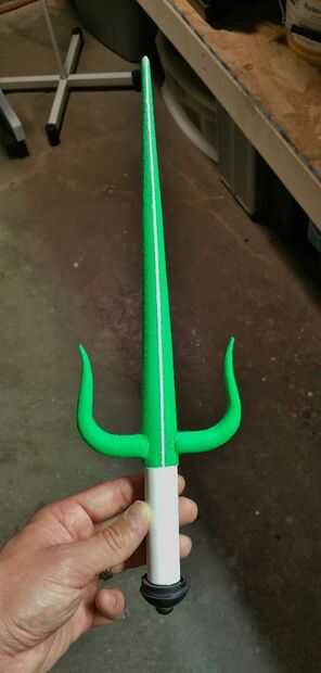 Los picos laterales se adhirieron a la espiga principal con cemento de contacto. También tuvieron una soldadura de pegamento y reforzados en un futuro paso. El mango fue adherido a las puntas con una buena cantidad de pegamento caliente. Arroja a chorros un montón de él dentro del pvc, entonces entregado mientras que en contacto con la espiga, así llenaría hasta el área donde las dos piezas de contacto. Este conjunto de contacto también se reforzó en un próximo paso.
