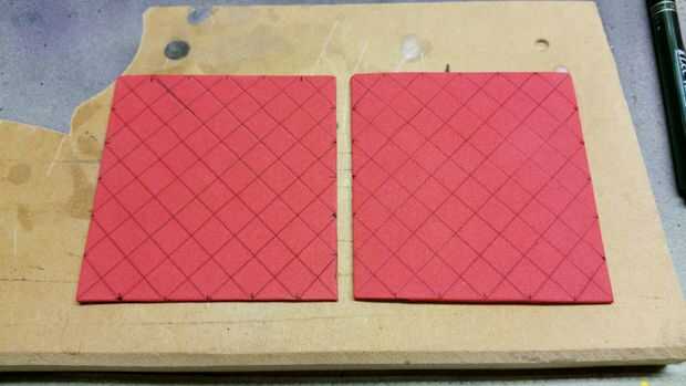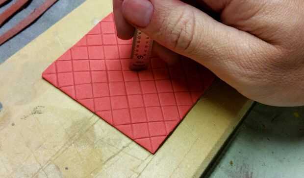 Corté trozos de espuma de artesanía fina para las dimensiones de la empuñadura. Hizo un poco más alto que el mango. Hice una marca cada 1/2" todo el camino alrededor de la espuma. Conecté estas marcas, al anotar con el borde de una regla de metal fino.
