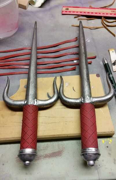 El paso final era envolver tiras de cuero alrededor de los picos secundarios y manija superior. Tenía algunos restos de cuero que corté en tiras estrechas con mi corte de caja. Estas tiras se lija para abrir el grano, después se pinta de rojo con pintura acrílica y cuando se seca, que apenó el rojo con papel de lija. Para estas tiras, puse una gota de pegamento donde quería la tira de cuero para comenzar. Envuelto el cuero alrededor del mango y puntas varias veces y se adhirió al final de la tira de cuero a sí mismo con más pegamento. Una vez, les di un lavado rápido con negro para un look de cuero mejor. Estas tiras fueron envuelto firmemente bastante para sostener que la empuñadura cubre en su lugar, razón por la cual no pegar a la manija. Estas tiras de cuero reforzaron también todos los empalmes de conexión de la espigas de lado y el mango.