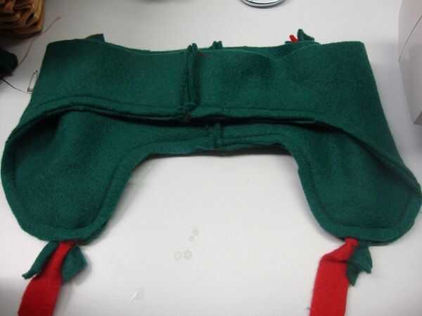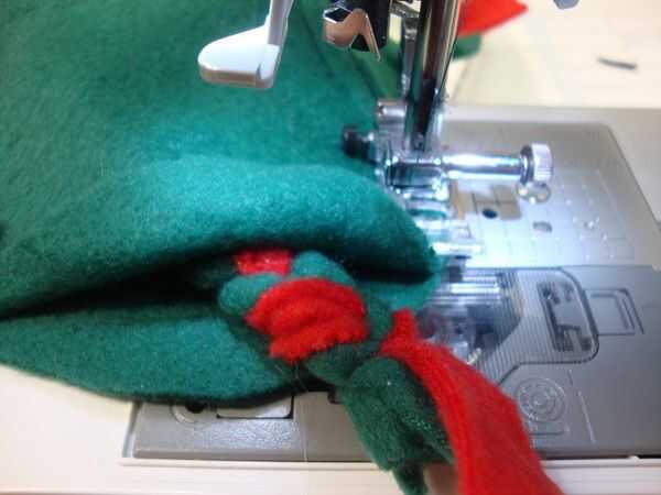 Coloque el borde de adentro hacia afuera sobre el derecho-lado-hacia fuera uno. Asegúrese de que las costuras coincidan y luego les pin allí. Coser a lo largo de la parte inferior, al llegar a las aletas del oído, inserte la trenza para que usted será coser el extremo de la trenza. (No el uno con el nudo).