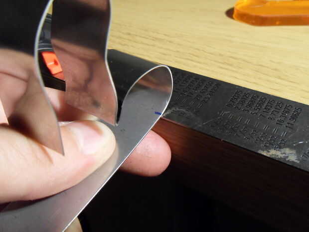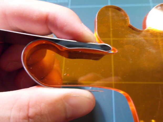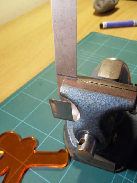 Puse mi cortador en un vicio en este punto y había doblado por mano hasta una curva de 90 grados con un radio de small-ish. Luego lo thwacked con un martillo para hacer la vuelta más apretado. Ahora retire del vicio y doblar el resto del camino, luego golpeó con el martillo para aplanarlo.