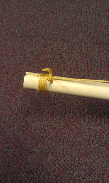 Elegir un nudo simple en un extremo del arco y dejar suficiente cuerda en el otro extremo que se muestra aquí como un cordón de zapato medio nudo. Esto permite que la cadena ser fácilmente sin encadenado, por lo que se puede ser volver a encadenado, como que se estira o pop aparte.
