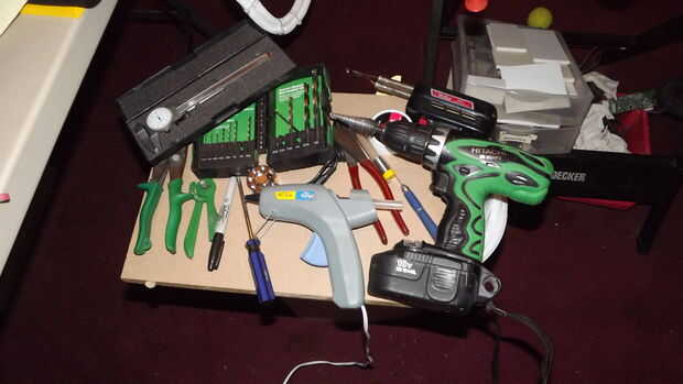 Taladro, brocas, brocas de pala, cortadores de alambre, x acto cuchillo, tijeras, pistola de pegamento caliente, brújula, pistola de soldadura de la soldadura, limpiador de alambre / fundente, destornillador, pinzas, pc. alambre