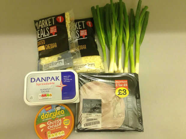 Utilizamos patatas, mantequilla, jamón, queso, cebollas y queso untable.