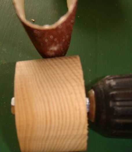 ¿Ninguna prensa del taladro, está bien, tienes una mano taladro? Necesitará taladrar un orificio en el centro de la pieza del carrete. Taladro un agujero poner un tornillo con una arandela en él a través del orificio ahora añadir otra arandela y una tuerca, apretar la tuerca y añadir una segunda tuerca y apriétela hacia abajo. Ahora Monte la tuerca del perno lateral en su taladro y apriete usted puede usar un pedazo de papel de lija grueso como en la foto para formar la bobina. O, ir tienes una herramienta dremel además el taladro puede utilizar pedacitos de talladora o lijar las ruedas mientras la pieza gira sobre el taladro.