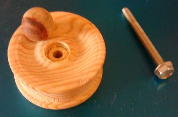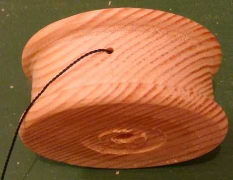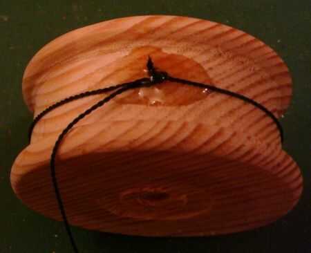 Perfore un pequeño agujero en el centro del borde del carrete. Pegamento CA en el orificio de goteo y empuje la cadena. Utilice el extremo de un clip de papel para empujar más la cuerda hasta que esté atascado completo. Entonces poner más pegamento sobre la parte superior del agujero y la cuerda.