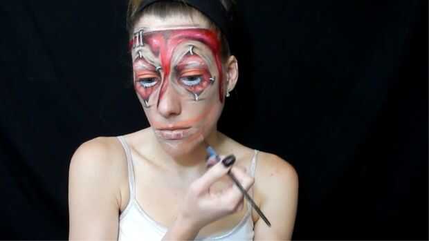 Cómo pintar la cara como el gato de Cheshire del videojuego Alice Madness Returns.Paso 1: base primer esbozo donde la boca se vaya, luego cubrir tu rostro en pintura gris dejando la sección de boca claro.Paso 2: piel para obtener la piel agregué manc