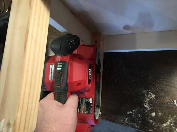 • A partir de un cinturón grueso de grano 80 fui sobre cada superficie ligeramente con una lijadora de banda. Esto derriba las clavijas y cualquier relleno sobrante al ras con el resto de la mesa y taburete.