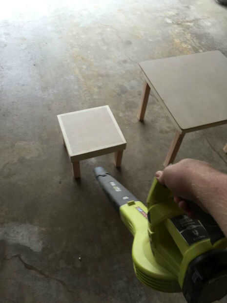 Después estaba acabado lijado puse la mesa y taburete en el suelo y procedió a soplar todo el polvo de mi taller con un soplador de hojas. Luego fui a tomar una ducha para dejar el polvo instalarse para conseguir limpiar con la aspiradora de taller y la escoba como debería haber hecho en primer lugar :) pero tuve una nube de polvo y fue muy divertido.