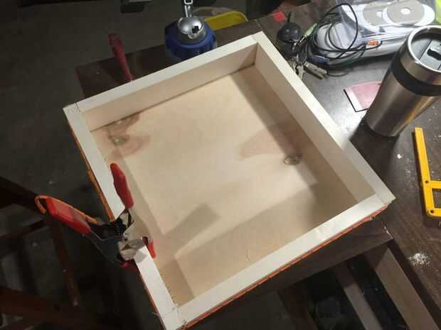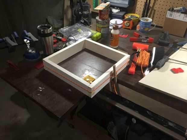 Para el taburete coloqué la cara superior hacia abajo sobre mi mesa de trabajo y pruebe la colocación de los 4 lados para averiguar lo mejor posible con mis articulaciones caja imprecisa. Después de lograr el mejor posible ajuste he quitado un lado y aplica pegamento de madera gorila a todas las caras que le mate.