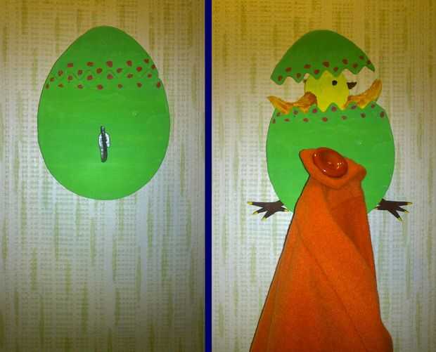 La idea básica es que cuando no hay ningún abrigo colgado en gancho, sólo se puede ver un huevo verde agradable. pero cuando usted colgar un abrigo en el gancho, se puede ver para incubar huevos, un pequeño pájaro con dos alas y dos patas!