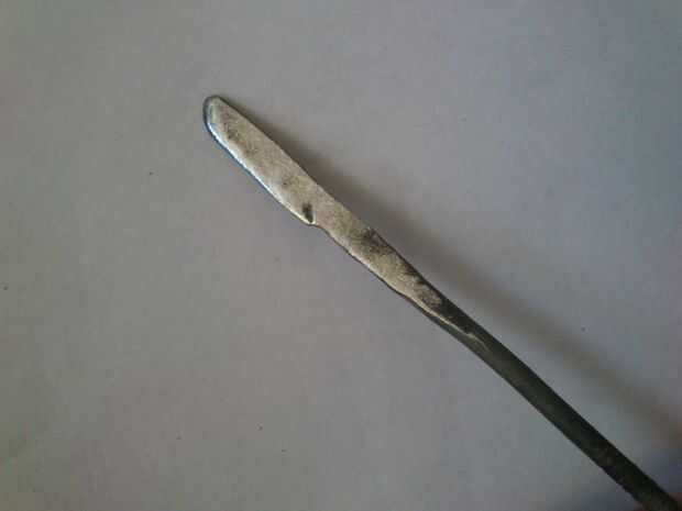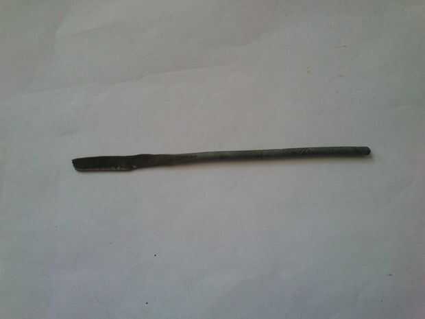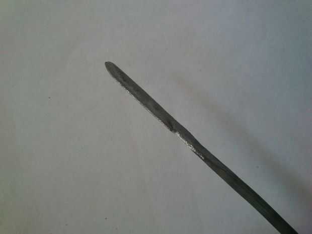 Con llama, hice la barra roja y suave, martillado de un lado para hacerla plana. Luego lijar para que sea un cuchillo pequeño! Sé que no es sharp! Pero corta!