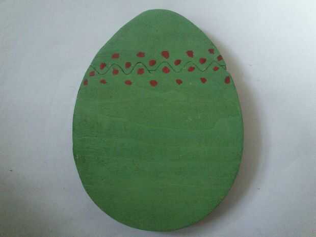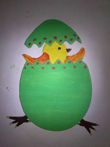 Pinté el huevo de color acrílico verde y algunos puntos de color púrpura. El pájaro es amarillo con naranja alas y patas de color marrón. No te olvides de las uñas amarillas.