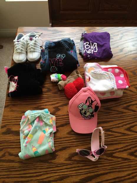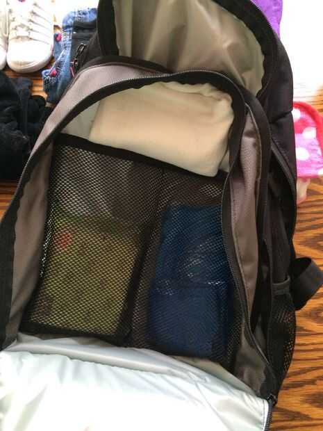 2 juegos completos de ropa. 1 es más ligera ropa de verano y la otra es los pantalones vaqueros y más pesada, largo de manga. 3 pares de calcetines y un par de zapatillas. Una sudadera con capucha light-ish. Un par de pijamas. 2 paños y una toalla con capucha. Un sombrero y gafas de sol y su "buddytag" están en el bolsillo superior.