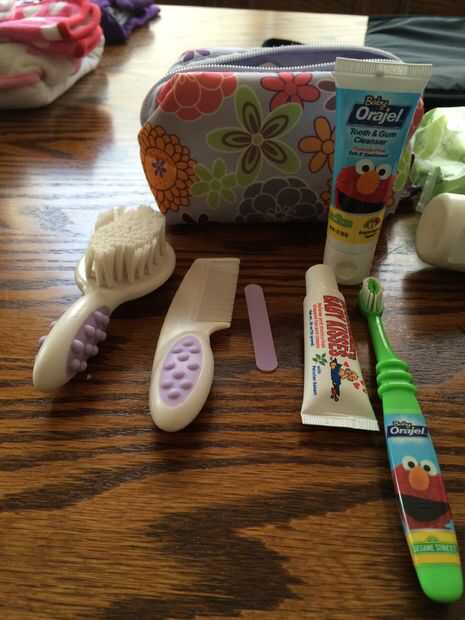 Un neceser pequeño tiene una pasta de dientes cepillo de dientes y el niño, peine, cepillo, bálsamo para los labios (que puede doblar como arrancador del fuego si es necesario) y algunas pequeñas placas de Emory.