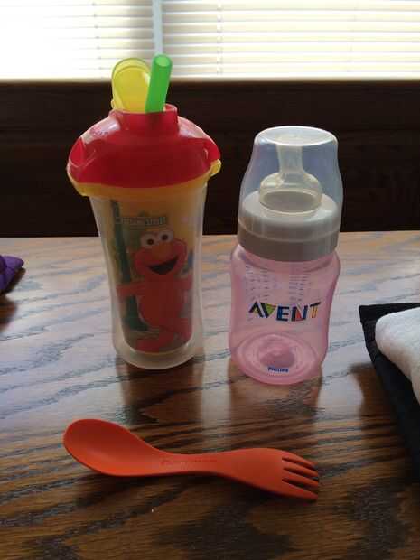 Una botella, vaso y una tenedor-cuchara (no no es un spork, es un tenedor de plástico resistente en un extremo y una cuchara en el otro. (La botella es avent clásico, tacita es munchkin y tenedor-cuchara es Light My Fire. Mi mamá los tiene en zulilly, pero también he visto algo similar (aunque adultos) en la sección de camping en walmart. botella y Copa fueron comprados en/bebés juguetes r nosotros.