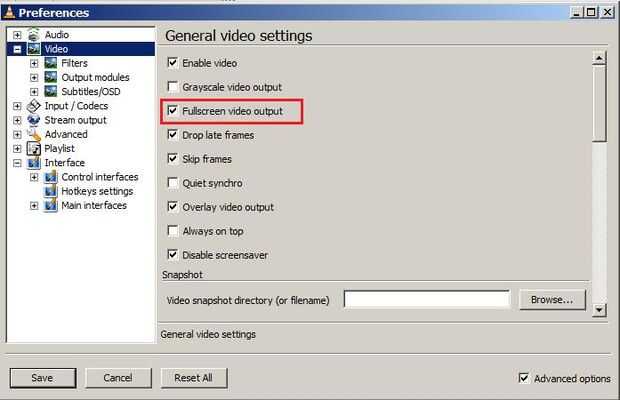Luego, abra Preferencias y configurar VLC para empezar en pantalla completa.