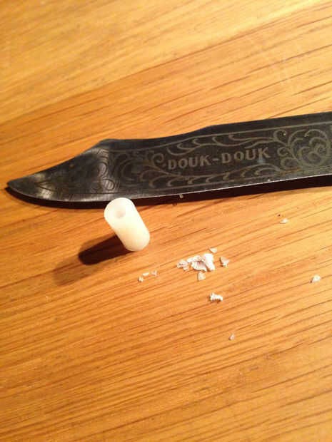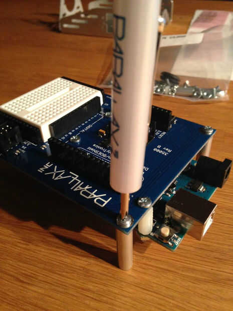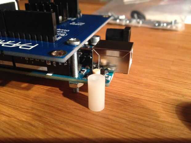 El bot del escudo tiene una guía muy completa de las instrucciones que vienen con él pero había un pequeño problema cuando yo estaba construyendo y que era que uno de los espaciadores de nylon que se incluye y debe sólo resbalón en pleno como los otros tres lo hizo para ayudar a independiente y mantener el Arduino Uno y aparte el tablero de paralaje , no encajaba. Este juego ha pasado por muchas iteraciones y las cosas han cambiado. Envié un mensaje a Adafruit para hacerles saber. Resolví este problema lijando la pieza hacia abajo un poco para que se ajuste. He incluido las imágenes del lijado.