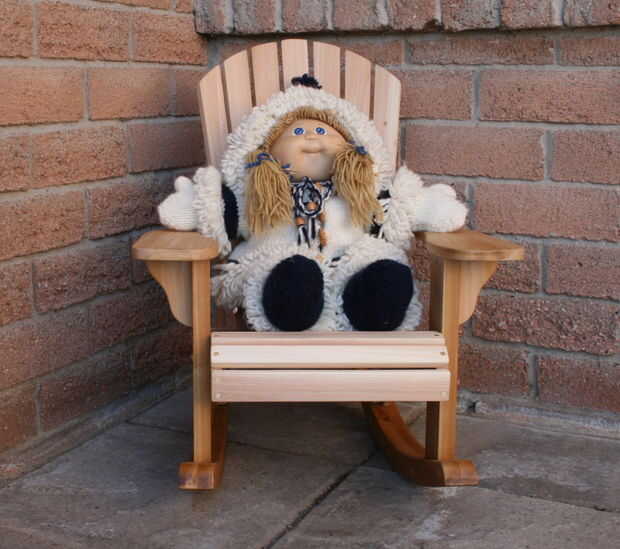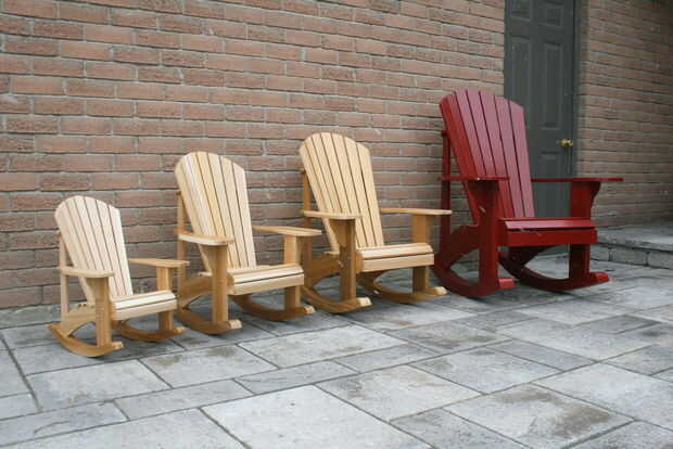 Estas tres sillas reducidas de la original adulto mecedora silla de Adirondack, pero construidas a partir de 5/8"(1.5 cm) cedro cerca las placas con tornillos de latón y tornillos. Proporcionalmente curvado asiento y respaldo permite a sus hijos las mismas comodidades que tienes en la silla de adulto y les da una oportunidad de crecer en los tres tamaños disponibles. Estas sillas son más anchos que la sillas de los niños regulares.