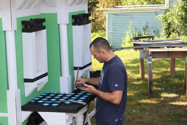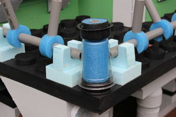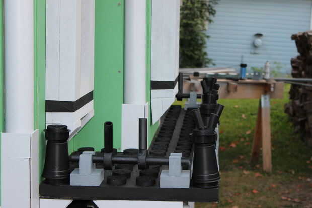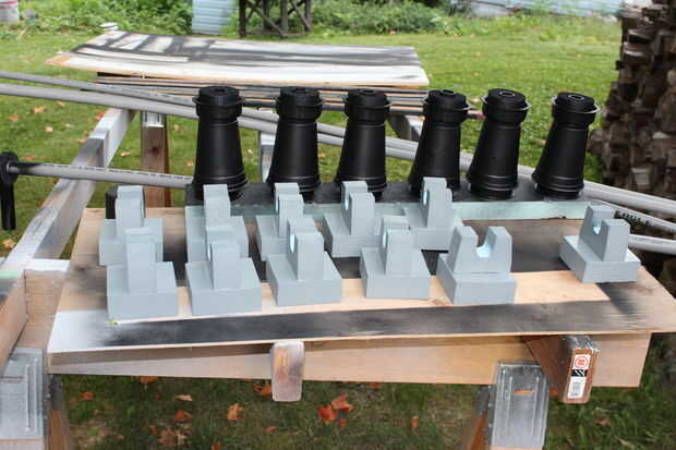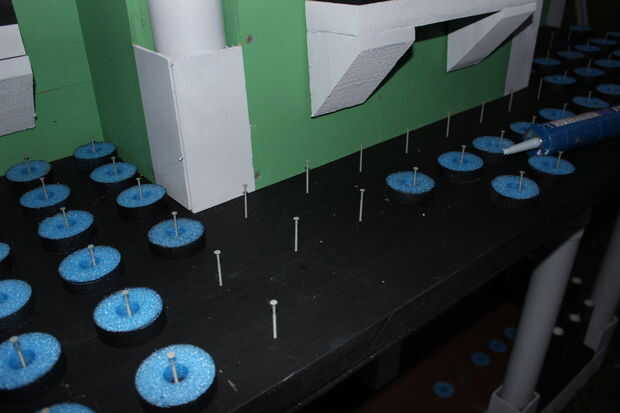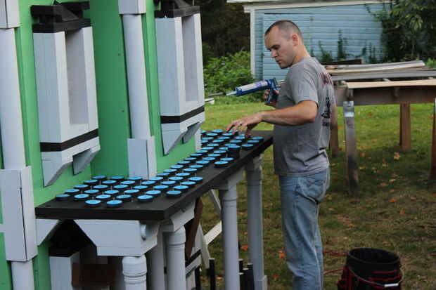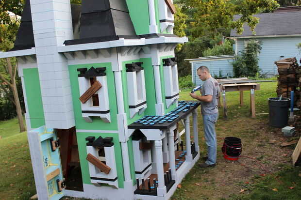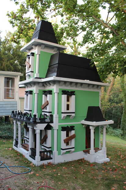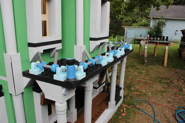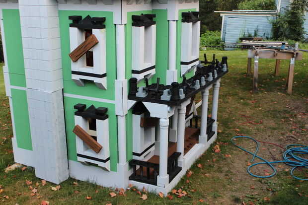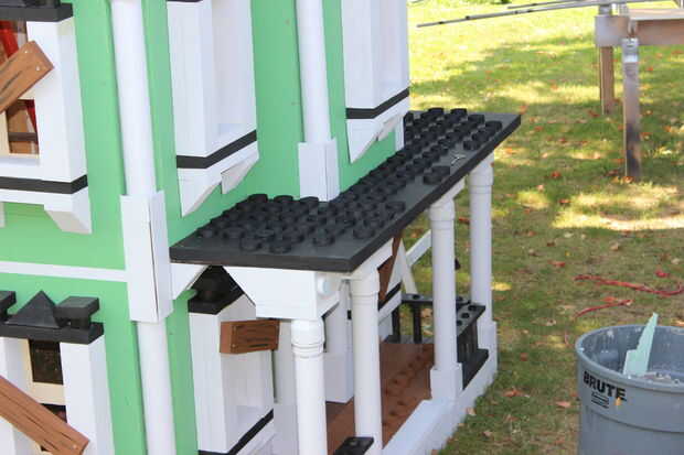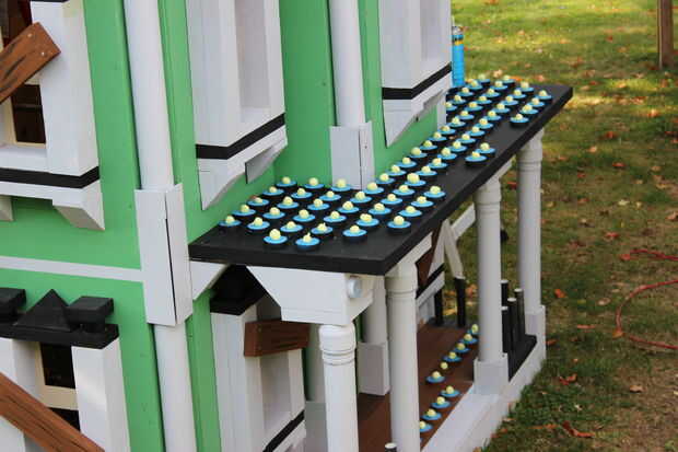 El techo del porche que es también una terraza balcón de, tuvo que ser acabado con el carril/picos/cosas circundantes. Con un montón de corte de espuma, PVC eléctrico, tallarines de la espuma, casquillos del tubo del impresora y tazas solas, se pusieron juntos para crear los pilares pequeños en el porche, así.