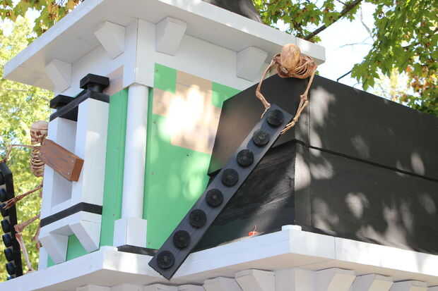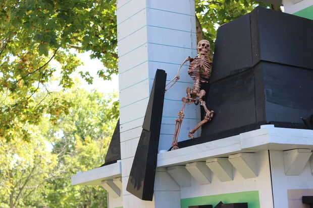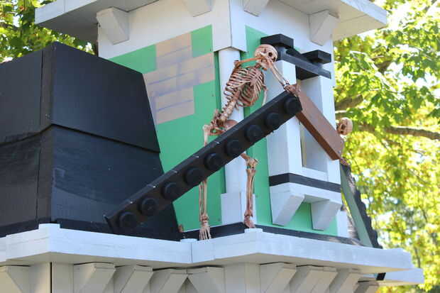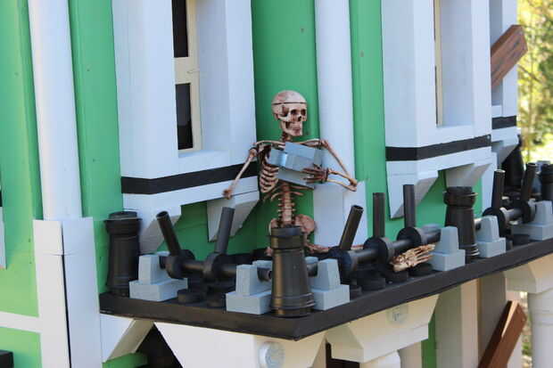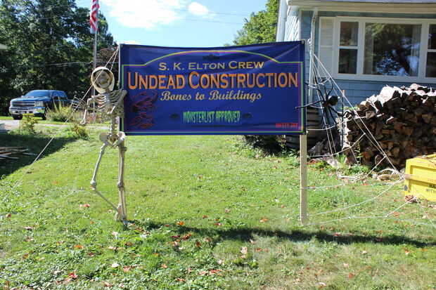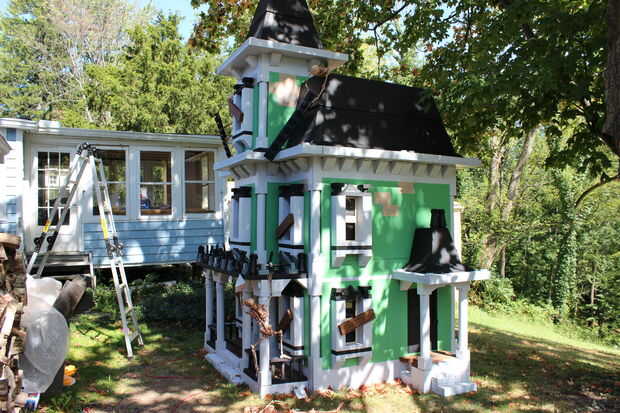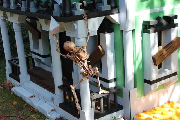 El equipo esquelético fue agregado para mostrar que la casa aún está en construcción. Un signo añadido a la yarda para el equipo de construcción
