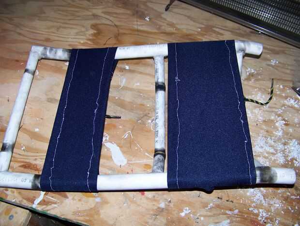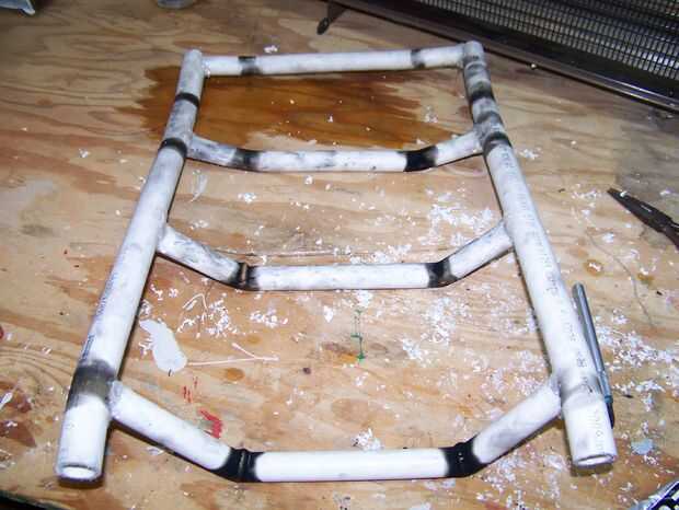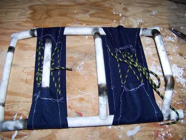 Tomó un largo vistazo en el marco de la mochila había utilizado para mi propio paquete de protones, mentalmente reducido al tamaño de mi hija y empezó a formar del PVC. Usé 3/4" PVC para los puntales verticales y 1/2" PVC para los puntales horizontales. No tengo una pistola de calor y también no me importa mi salud (bien, realmente hice al lado de una ventana abierta y usaba una máscara de respiración), así que tiré de una vela, calienta el PVC y doblado en la forma que quería.