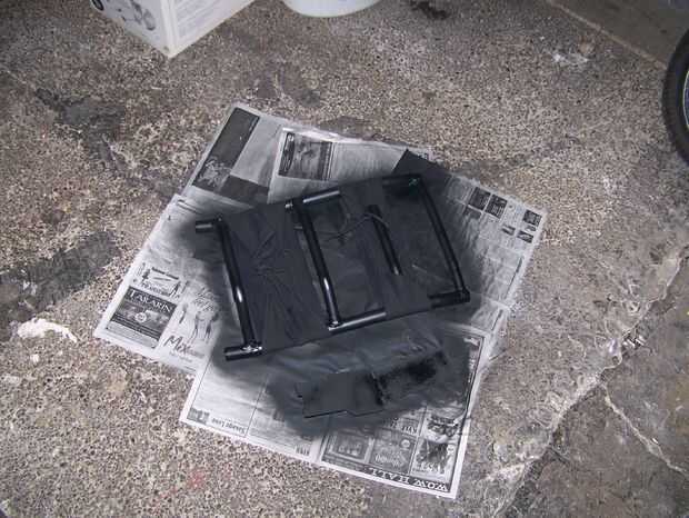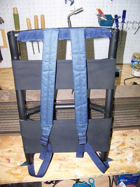 Que curado, mientras que cuidadosamente he intentado recordar cómo usar una máquina de coser y un par de soportes traseros (ver imagen). Es bueno que los sobre las costuras en parecía habían sido cosidos por un borracho pinté. Rosca un cordón fuerte en cada uno, y después había curado del epoxi había atado les en tan fuerte como pude. Me sacó otra vez la pintura en aerosol y encubrieron el hecho de que parecía clase de mierda. Una vez seca la pintura, sin embargo, parecía bastante agradable!